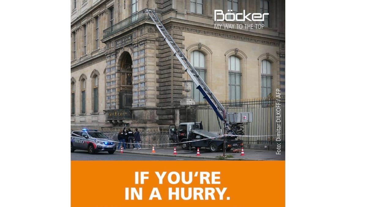 Da tyve stjal kronjuveler for 650 mio. kr. fra Louvre med en Böcker-lift, reagerede det tyske liftfirma lynhurtigt: "Wenn's mal wieder schnell gehen muss" med billede af deres lift foran Louvre. Dristigt. Hurtigt. Genialt. Böcker viste hvordan man stjæler opmærksomhed fra en tyv.