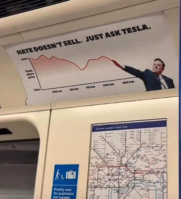 "Tesla The Swasticar. Fra 0-1939 på 3 sekunder." Brutal. Effektiv. Fortjent. Kampagnen pryder Londons undergrundsbane og cirkulerer som memes. Tesla bløder. Hvorfor? Fordi Elon Musk heilede to gange ved Trumps indsættelse. Fordi han bad boy brandjacked sit eget brand så hårdt, at ejere nu sætter klistermærker på bilerne: "Bought it before Musk went crazy." Swasticar er ikke subtil. Men den virker.