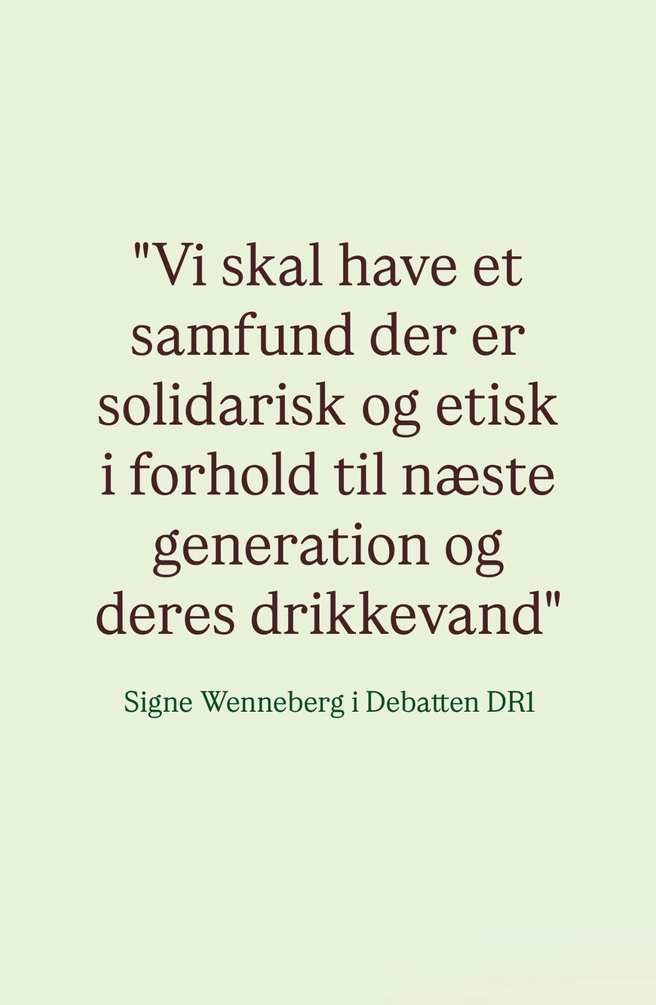Citat grafik "Vi skal have et samfund der er solidarisk og etisk i forhold til næste generation og deres drikkevand".Fra Debatten på DR1. Abstraktionsstigen ned til noget konkret: drikkevand.