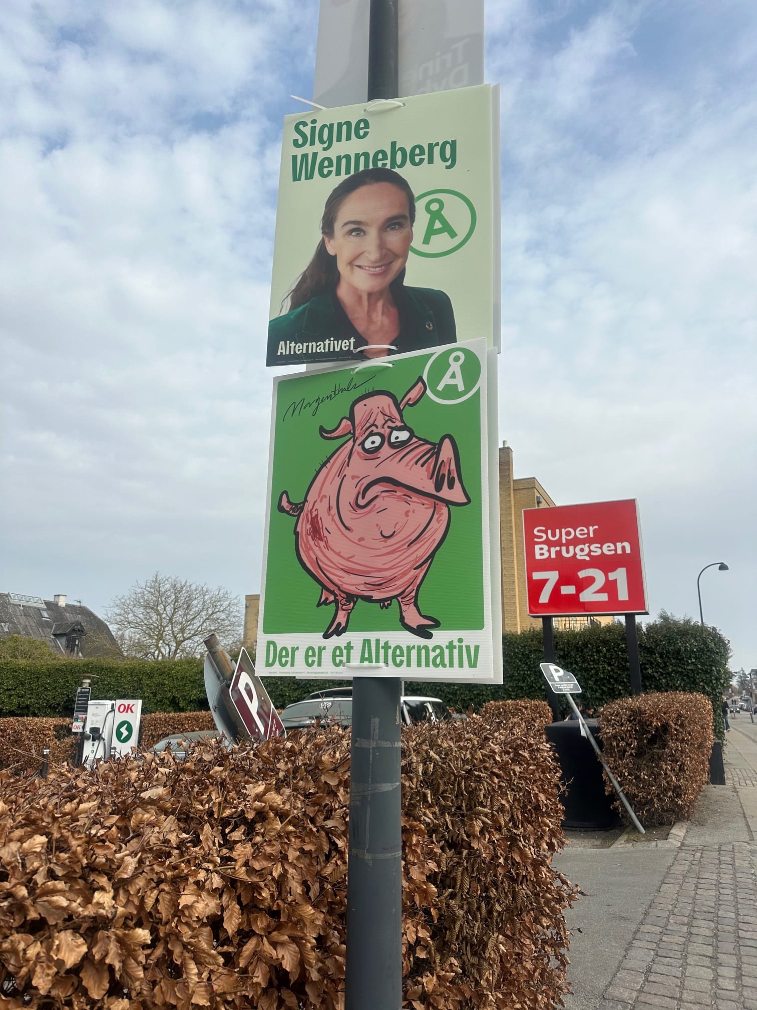 Plakaten "Der er et Alternativ" med grisen på lygtepæl. På lygtepæle i 13 kommuner rundt om København.