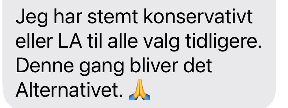 Sms-skærmbillede "Jeg har stemt konservativt eller LA til alle valg tidligere. Denne gang bliver det Alternativet." Billedtekst: Beskeden der bekræftede strategien. Grønne stemmer kan komme fra steder, hvor de normalt ikke ligger.