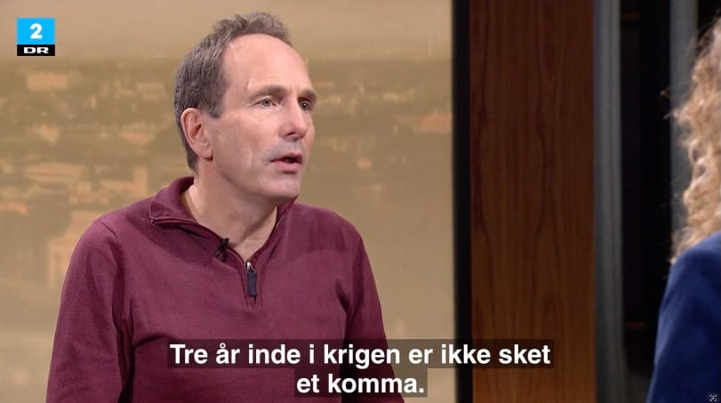 Peter Viggo Jakobsen om dansk afhængighed af amerikanerne den 14. januar 2025. Med eksemplet ammunitionsfabrikken i Elling i Nordjylland: ”Tre år inde i krigen er der ikke sket et komma. Det vidner om, at det tager tid at fjerne sådan et afhængighedsforhold. Der er intet alternativ til amerikanerne, hvis du vil købe meget og godt grej på den korte bane.” Kilde: Deadline på DRTV den 14. januar 2025