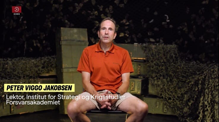 Peter Viggo Jakobsen i orange polo og beige shorts som ekspert i explaineren P3 Essensen: Er krig en god forretning? Kilde: DR den 9. september 2023.