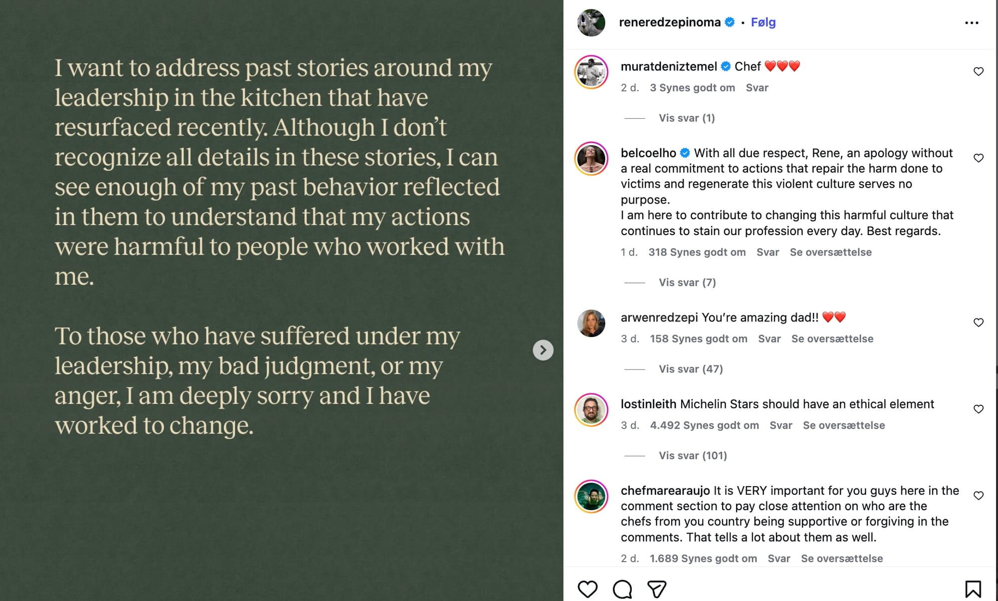 "Han har sagt undskyld" er en ynkelig standard for ansvar, når vi taler om gentagen vold. Redzepi skrev i 2015, at han havde været "a bully for a large part of my career". I 2023 indrømmede han, at Noma var "unsustainable" som arbejdsplads. Nu i 2026 den samme øvelse igen. En undskyldning, der skal gentages tre gange over et årti, er ikke en undskyldning. Det er en pressestrategi.