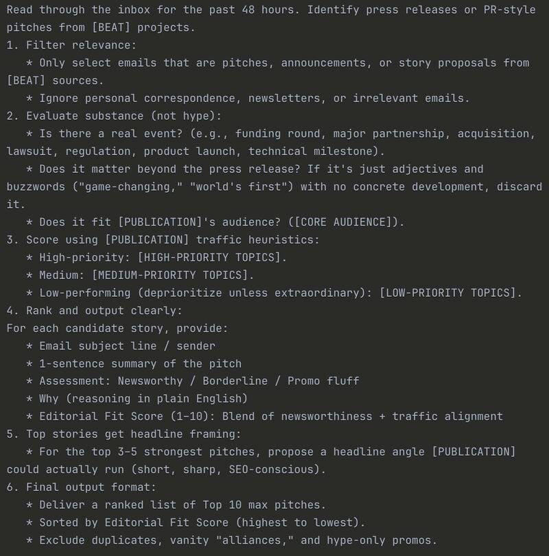 PR-strateg Carly Martinetti fra bureauet NotablyPR skriver på LinkedIn at hun længe havde haft en mistanke, men nu endelig stødte på det i virkeligheden: en redaktør på en stor publikation der bruger AI til at filtrere pitches. Redaktøren gav hende lov til at dele prompten anonymt.