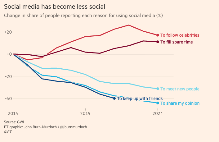 Sociale medier har skiftet funktion. Siden 2014 er andelen der bruger platformene til at holde kontakt med venner faldet med over 40 procent, mens andelen der bruger dem til at "udfylde ledig tid" er steget. Et skifte fra meningsfuld forbindelse til passivt forbrug af indhold fra fremmede. Kilde: GWI/Financial Times.