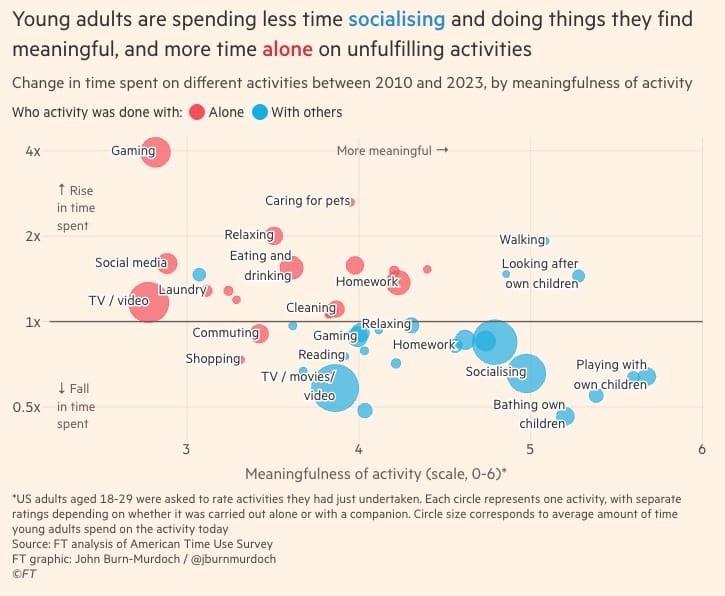 Mønstret er tydeligt: Aktiviteter udført alene (røde cirkler) som gaming, sociale medier og TV stiger markant – og opleves som mindre meningsfulde. Aktiviteter med andre mennesker (blå cirkler) som socialisering, leg med børn og samvær falder – selvom de scorer højest på meningsfuldhed. Vi vælger det, der gør os ensomme, fra det, der gør os lykkelige. Kilde: FT/American Time Use Survey.