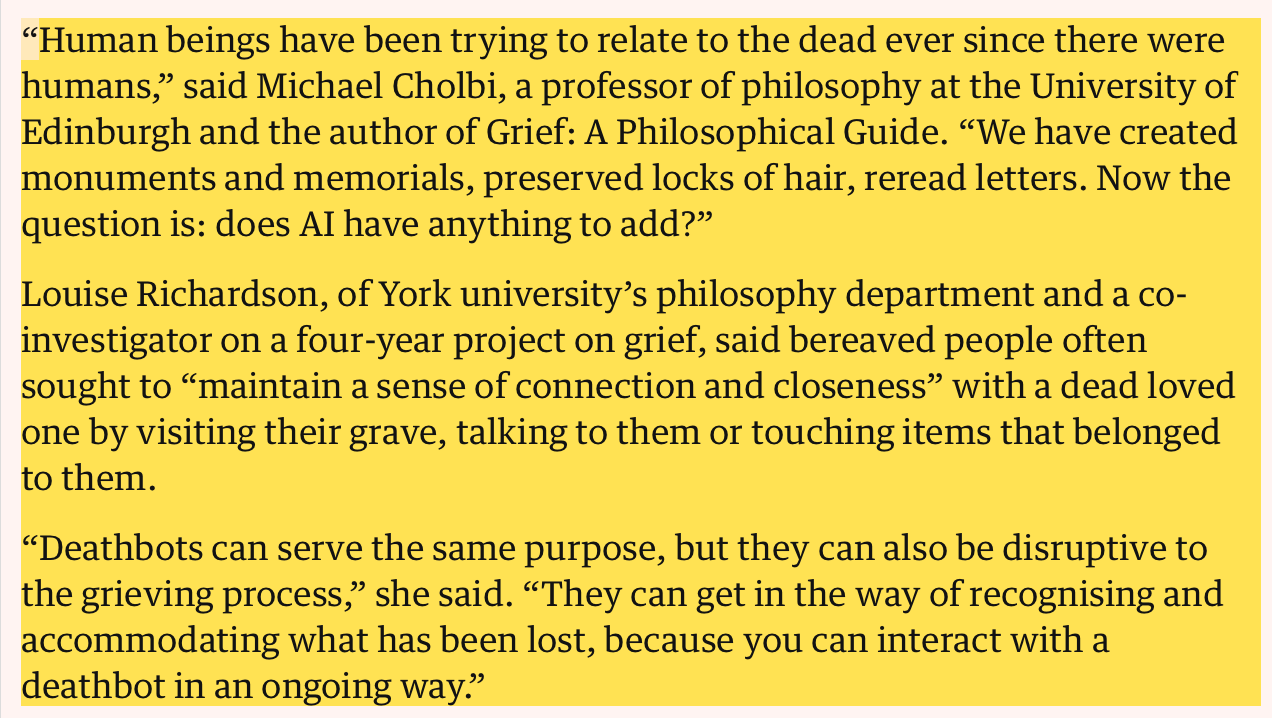 Som filosof Michael Cholbi siger: “Mennesker har forsøgt at relatere til de døde, lige siden der fandtes mennesker. Vi har rejst monumenter og mindesmærker, gemt lokker af hår, genlæst breve. Nu er spørgsmålet: Har AI noget at tilføje?”.