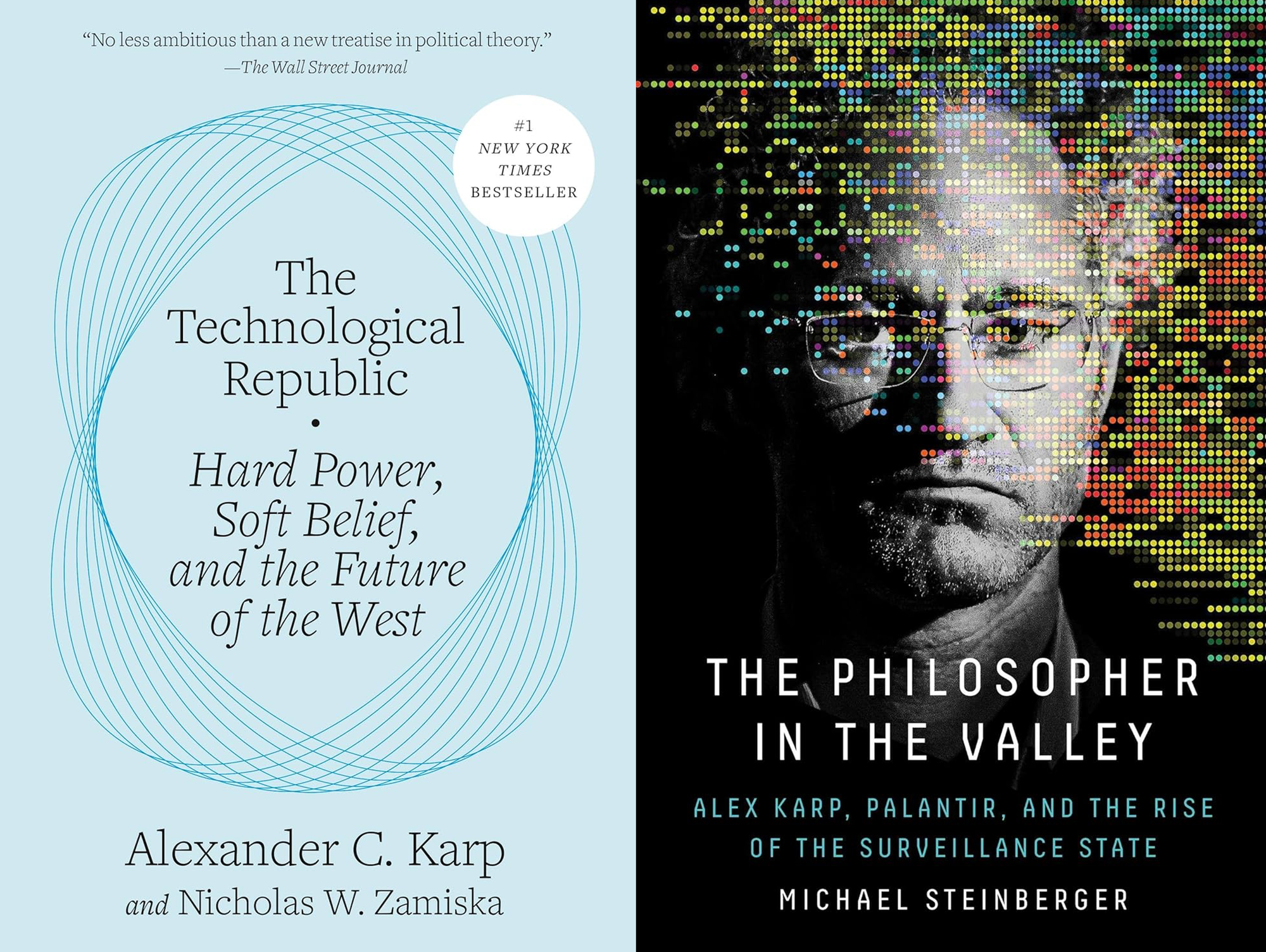 3) den anden co-founder Alex Karp (sammen med Tiel), er hovedfiguren i Michael Steinbergers The Philosopher in the Valley (2025), en biografisk og analytisk fremstilling af Karp og Palantir, og Karps egen bog (med Nicholas Zamiska) The Technological Republic (2025), der kan læses som et manifest for en teknologisk revitalisering af “Vesten”. Den første bog udtrykker den konkrete magtpraksis, og Karps egen bog er en direkte normativ programerklæring.