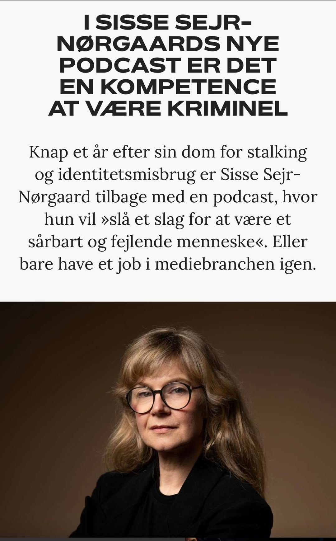 Sisse Sejr-Nørgaard blev i oktober idømt 30 dages ubetinget fængsel for stalking og identitetstyveri mod en kvindelig madblogger. 81 dokumenterede handlinger over 39 dage. Kvinden havde haft en affære med Sisse Sejrs ægtemand, Esben Bjerre. Straffen er afsonet med fodlænke. 3,5 måneder senere sidder Sisse Sejr bag mikrofonen på Podimo.