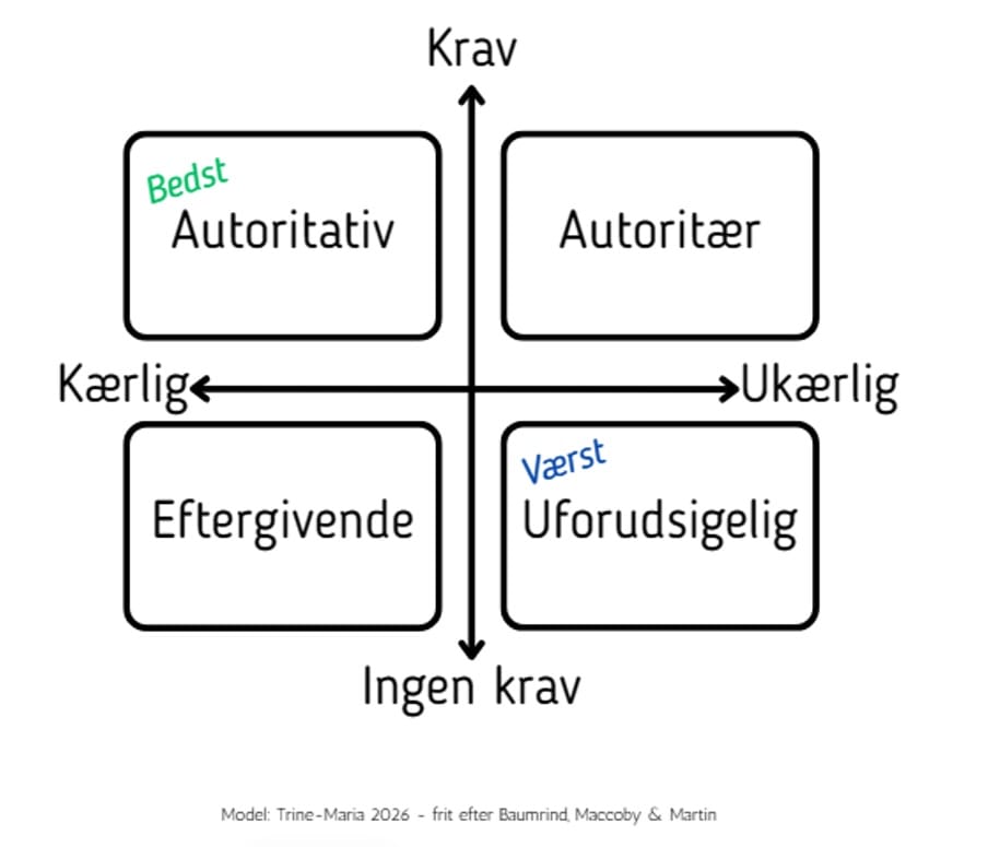 Modellen viser, hvordan opdragelse kan placeres på to akser: kærlighed (varm-kold) og krav (høje-lave). Den ideelle opdragelse er autoritativ – både kærlig og kravstillende.