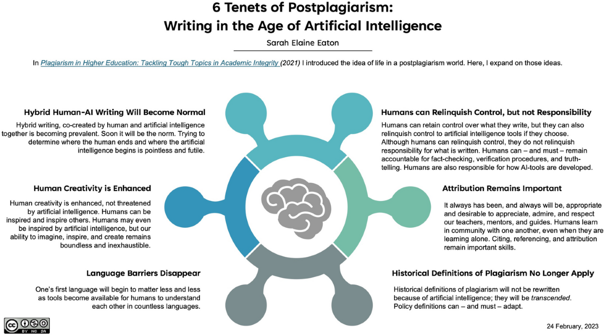 I artiklen med den mundrette titel “Postplagiarism: transdisciplinary ethics and integrity in the age of artificial intelligence and neurotechnology” drøfter den canadiske forsker Sarah Elaine Eaton, hvordan vi egentlig skal forstå begrebet ’plagiat’ i en tid, hvor kunstig intelligens er blevet allemandseje