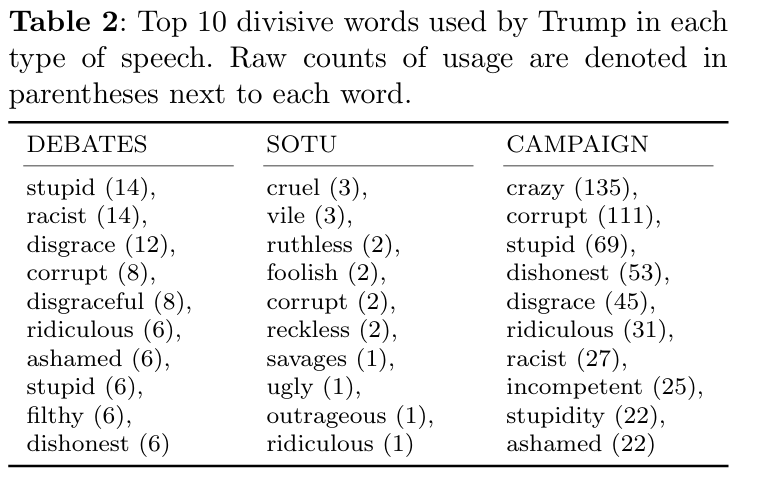 Høj frekvens af delegitimerende ord. Forskerne udviklede et leksikon med 178 "divisive words" - sprog der nedgør modstanderen. I valgkamptaler brugte Trump "crazy" 135 gange, "corrupt" 111 gange, "stupid" 69 gange. Ingen anden kandidat kommer i nærheden.