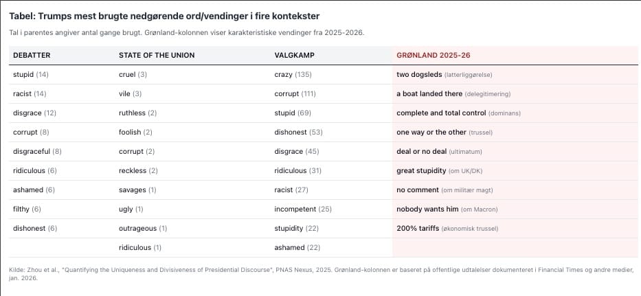 I Grønland-retorikken dominerer latterliggørelse og delegitimering. "A boat landed there" afviser Danmarks suverænitet. "Two dogsleds" håner forsvarsevnen. "Complete and total control" erstatter "køb". Han taler til Danmark som en ejendomsudvikler til en genstridig lejer. Ikke som allieret til allieret.