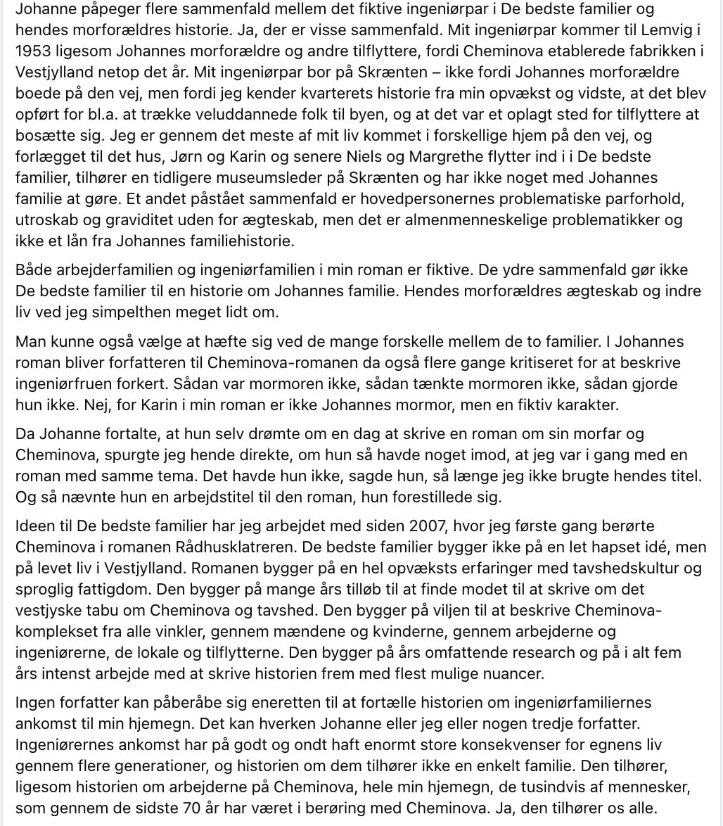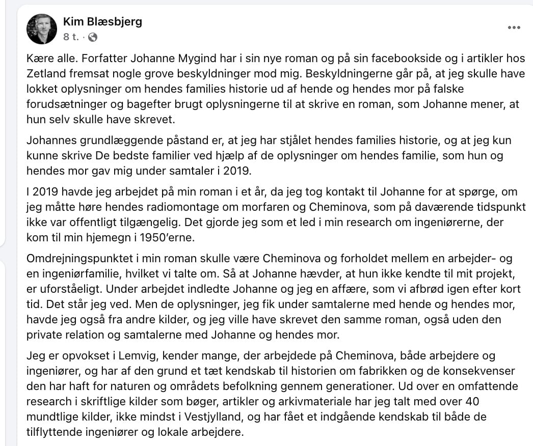 Kim Blæsbjerg befinder sig pludselig i centrum af en litterær storm. Efter udgivelsen af Johanne Myginds roman Giftig en personlig fortælling om hendes bedsteforældre og Cheminova-skandalen bliver Blæsbjerg beskyldt for at have taget historien til sin egen succesroman De bedste familier. Mygind hævder, at han kendte familiehistorien før han skrev sin bog. Midt i beskyldningerne om plagiat, etik og ejerskab over virkeligheden svarer Blæsbjerg igen med et langt forsvar på Facebook, hvor han forsøger at tage kontrollen over fortællingen om sig selv og om, hvem der egentlig har ret til at skrive historien om Cheminova. Læs det her: