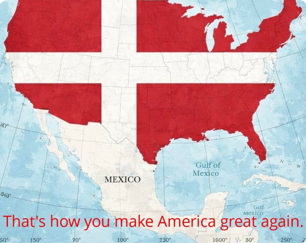 Et satellitbillede af Nordamerika, hvor det amerikanske flag er skiftet ud med et altomsluttende Dannebrog. Teksten lyder: "Vi bytter ikke. Vi overtager. #DenmarkFirst"]