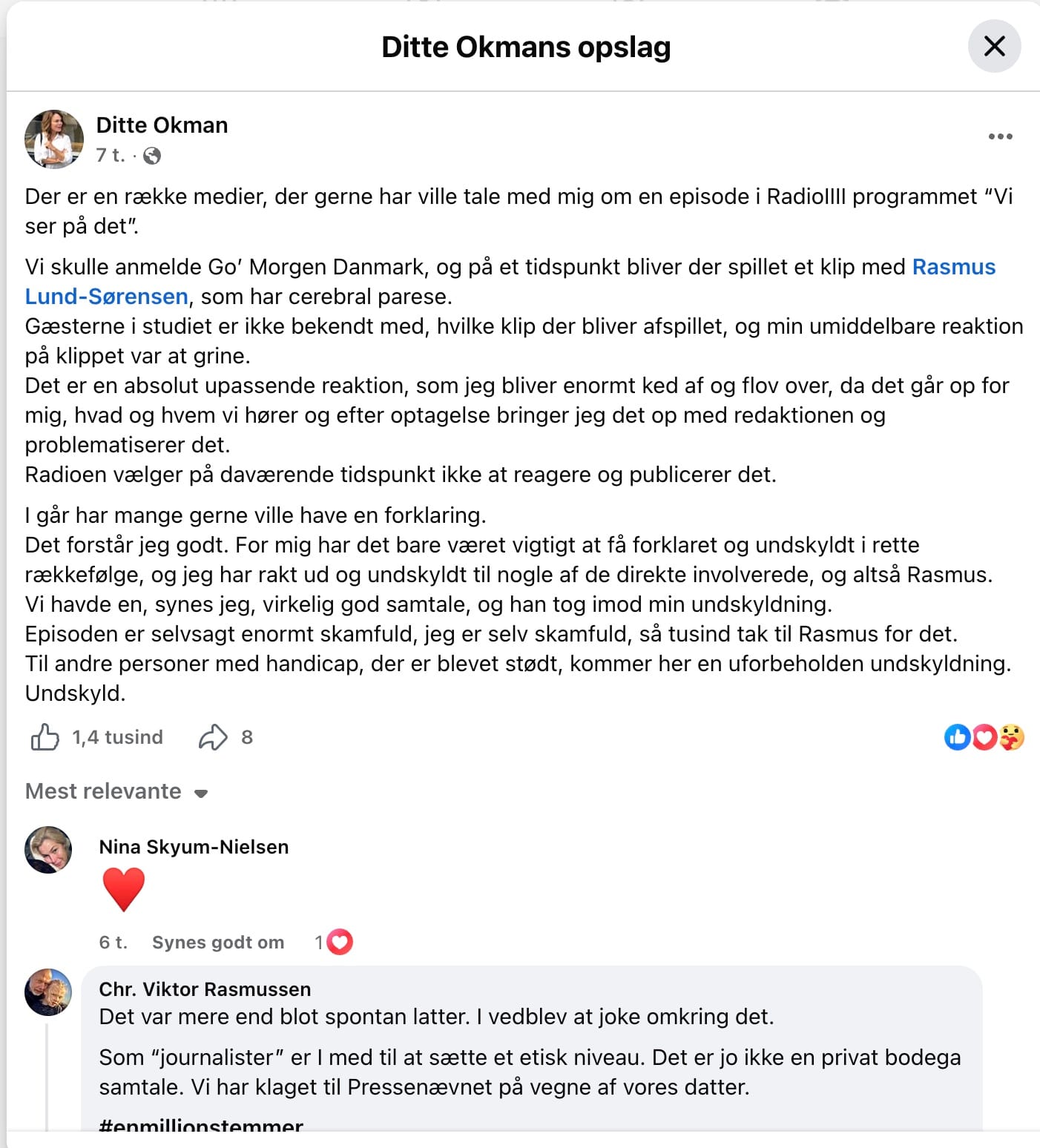 Jeres forsøg ud i damage-control og undskyldninger er heller ikke et professionelt medie værdigt ("Værterne var ikke forberedt på at der deltog en person med CP, så derfor grinede værterne". Øh, det viser jo blot værternes habitus med klar tydelighed. Om de så undskylder bagefter eller ej). Jeres værter (det tæller også Mikkel Lind Sorgenfrey her), programmer og redaktionelle processer er helt uden for public service-skiven. Sig det nu som det er. Og handl på det.