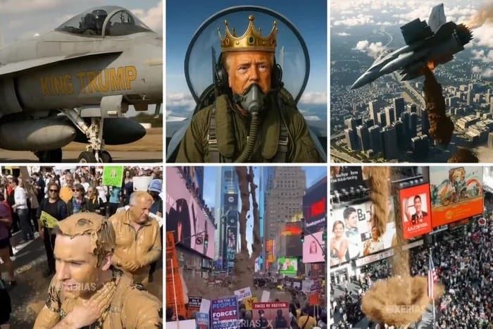 Trumps respons på "No Kings"-protesterne afslører både styrken og sårbarheden i bevægelsens narrativ. På Truth Social postede han en kaskade af AI-genererede videoer, hvor han fremstilles som alt fra superhelt-pilot til rumkaptajn – en digital omnipotens-fantasi, der ironisk nok bekræfter protesternes pointe om autokratiske ambitioner.