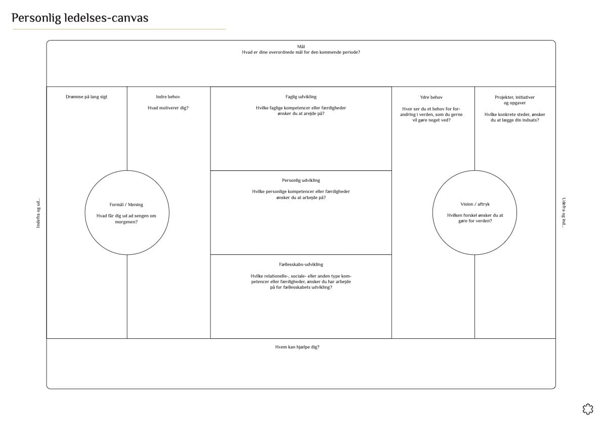 Canvas'en består af ni felter, som giver dig et visuelt overblik over, hvad der driver dig, hvor du står lige nu, og hvad du ønsker dig fremadrettet. Værktøjet giver dig både muligheden for at arbejde indefra ud (hvad er vigtigt for mig) og udefra ind (hvad kalder verden på jeg gør/er). Du arbejder med alt fra din motivation og dine værdier til dit ansvar, din næste udvikling og hvem, der kan hjælpe dig på vej. Det handler ikke om at evaluere dig selv – men om at blive klogere på dit eget ståsted, så du bedre kan navigere, prioritere og måske justere kursen.