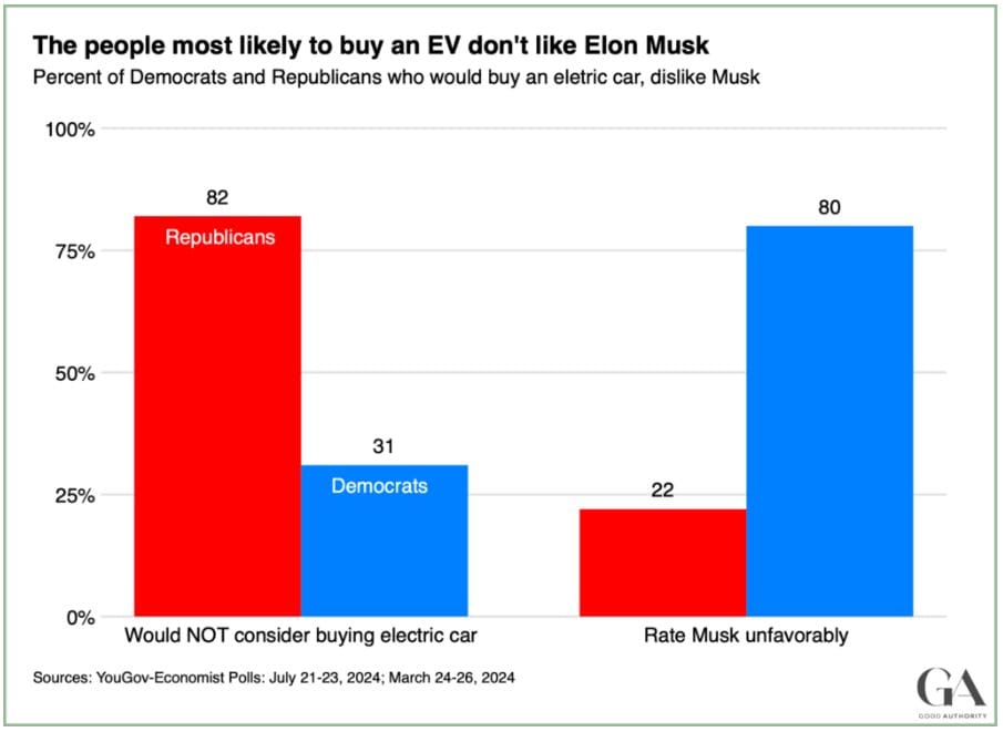 Faktisk er republikanernes modvilje mod elbiler på niveau med demokraternes modvilje mod Musk efter han er sprunget ud som MAGA-støtte.