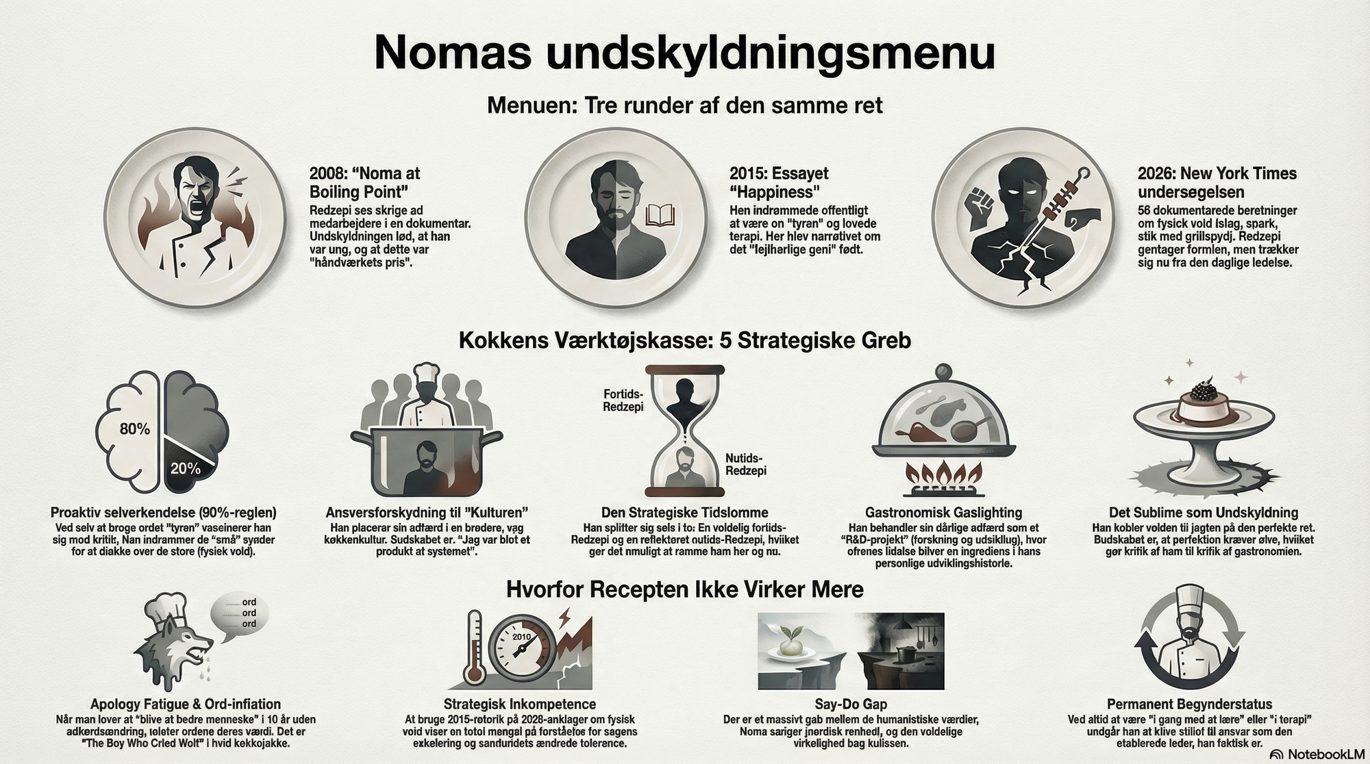 Tilsammen udgør disse fem greb en diskursiv kontrolstruktur, der har gjort Redzepi til sin egen fortællers herre. Krisestyringen har ikke været designet til at stoppe adfærden. Den har været designet til at gøre adfærden æstetisk acceptabel.