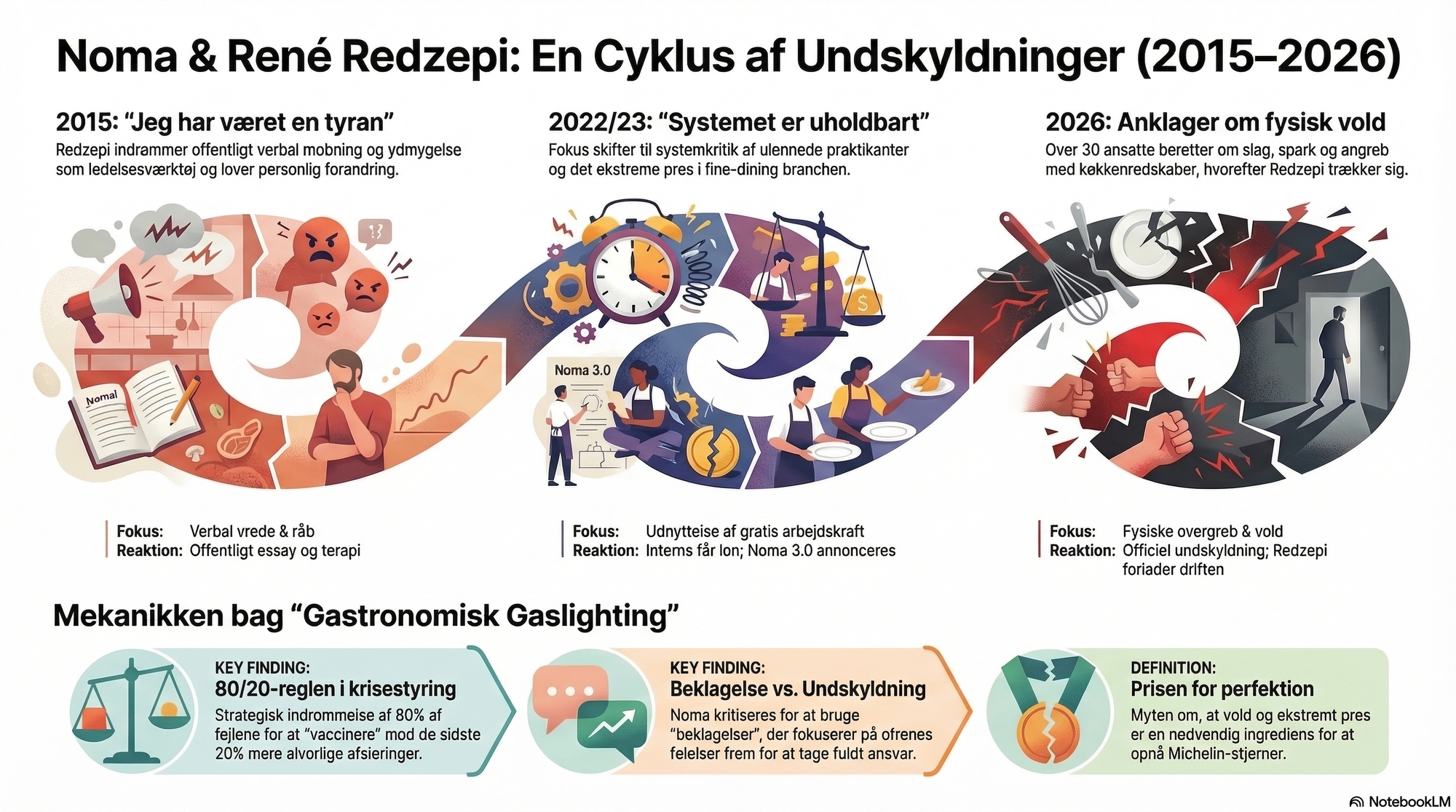 Andet greb er ansvarsforskydningens retorik. Redzepi placerer konsekvent sin adfærd i en bredere køkkenkultur, hvor skrig og frygt var normen. Han siger det ikke direkte, men implikationen er klar: Jeg var et produkt af en syg kultur. I Benoits terminologi er det en klassisk ansvarsforskydning, og den underminerer selve undskyldningen. Man kan ikke samtidig sige "jeg tager ansvar" og "kulturen var sådan dengang". De to udsagn ophæver hinanden. Det er et say-do gap, der udvider sig med hver gentagelse.