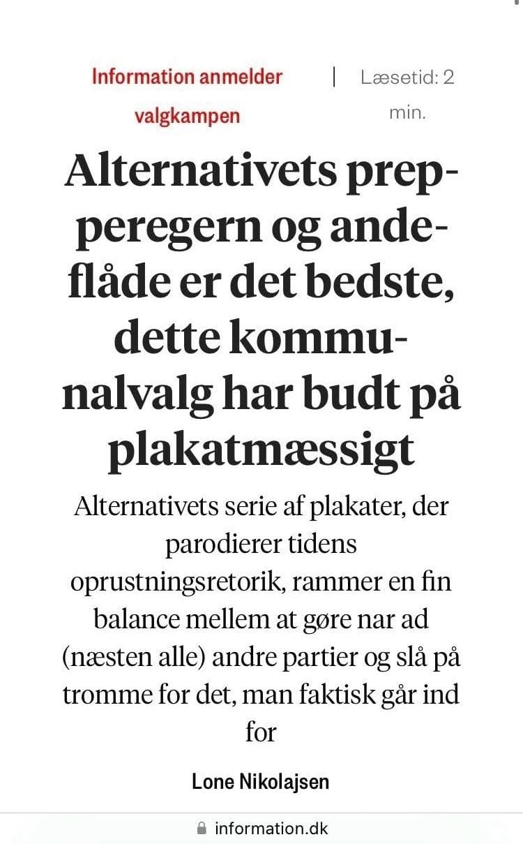 Information kalder Alternativets kampagne for "det bedste, dette kommunalvalg har budt på plakatmæssigt." Anmelderen fremhæver, hvordan kampagnen kombinerer oprustningsretorikken med billeder af den natur, partiet vil beskytte. Det er præcis den type omtale, kampagnen er designet til at skabe.
