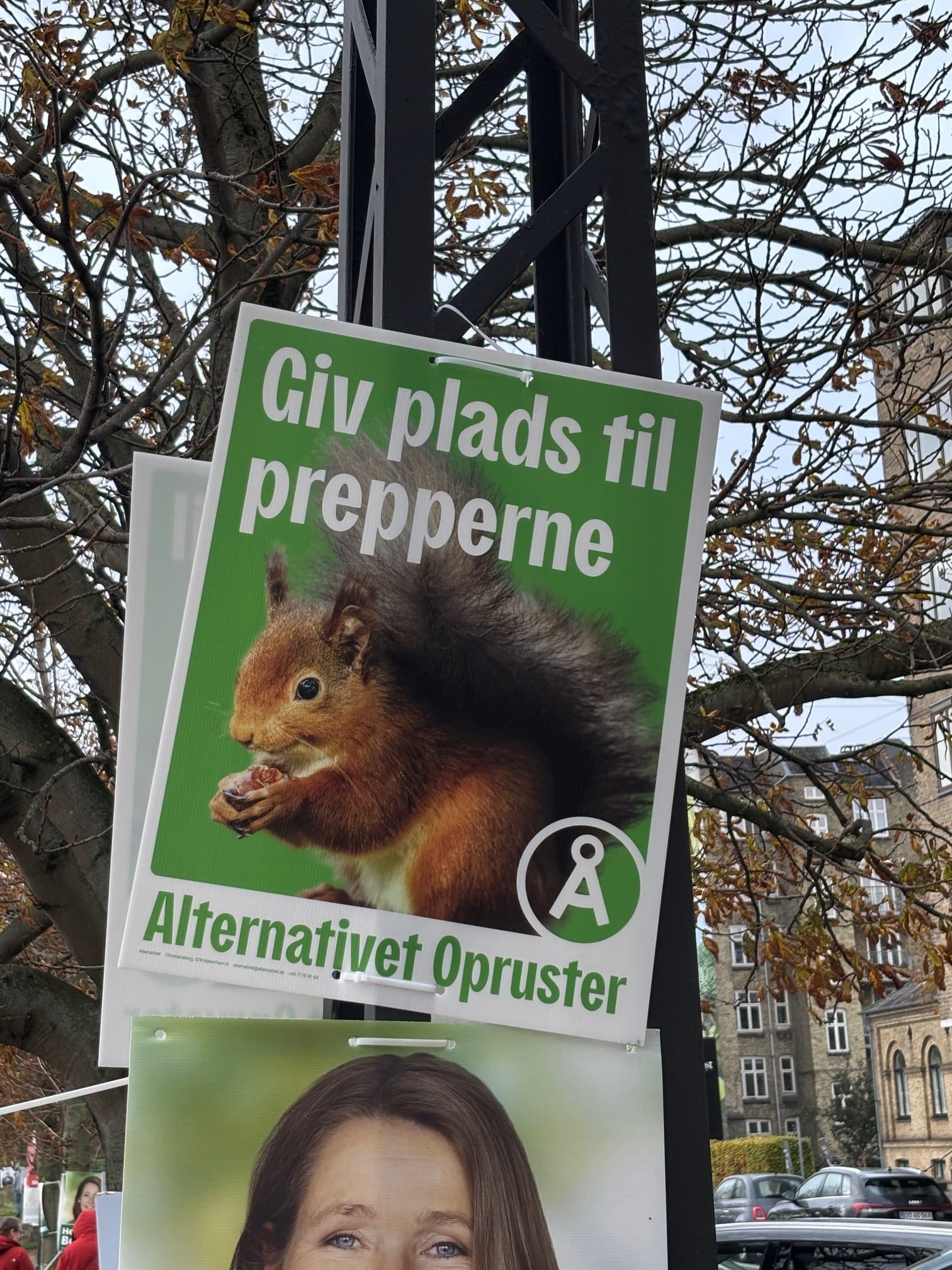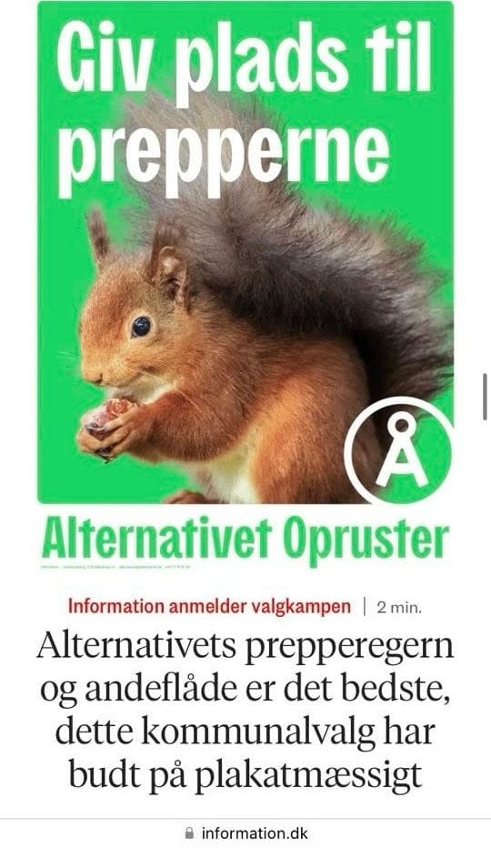 "Giv plads til prepperne" – egernet med nødden er kampagnens mest ikoniske motiv. Billedet fungerer, fordi det er umiddelbart sympatisk, men budskabet er alvorligt: Naturen har brug for plads i byen. Information roser, hvordan Alternativet formår at gøre den grønne dagsorden folkelig uden at være populistisk.