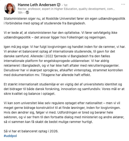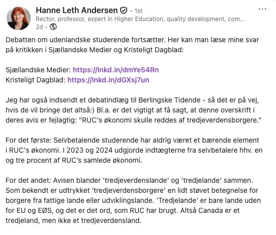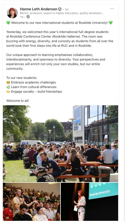 For mindre end en uge før denne analyse blev skrevet - mens RUC stadig kæmpede med efterdønningerne af krisen - publicerede Hanne Leth Andersen dette LinkedIn-opslag: