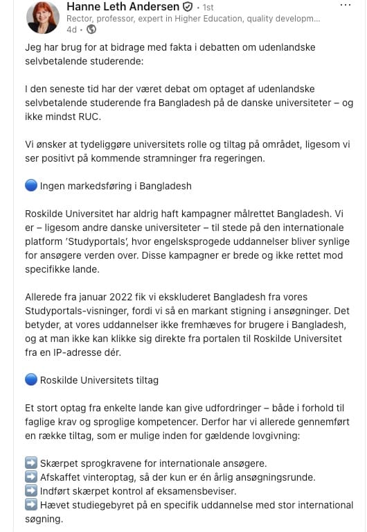 Som Frihedsbrevet afslørede, havde RUC allerede i 2022 ekskluderede Bangladesh fra deres Studyportals-kampagner på grund af den "markante stigning i ansøgninger." De vidste problemet var der. De vidste det blev større. Men de valgte at putte sig med det i stedet for at kommunikere proaktivt.