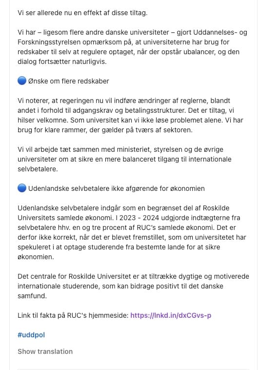 Opslaget illustrerer det ultimative problem i Hanne Leths krisekommunikation: Hun forstod aldrig, at det ikke handlede om de faktuelle detaljer i RUCs optag. Det handlede om, hvorvidt RUC prioriterer internationale studerendes betalingsevne over dansk samfunds behov.
