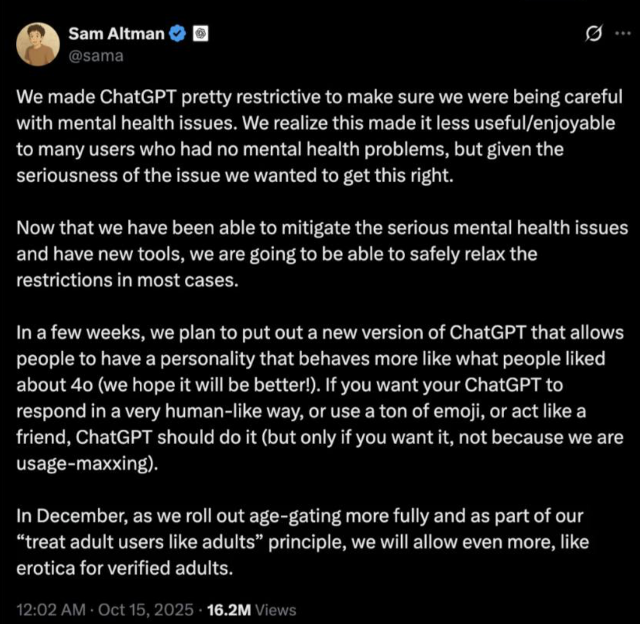Den 14. oktober 2025 meddelte OpenAI, at ChatGPT fra december 2025 vil tillade modent indhold (mature content) for brugere, der verificerer, at de er voksne. Sam Altman (OpenAI’s CEO) formulerede det som en del af princippet “treat adult users like adults”. Samtidig planlægges funktioner som valg af tone og personlighed i ChatGPT (“If you want your ChatGPT to respond in a very human-like way, or use a ton of emoji, or act like a friend…”).