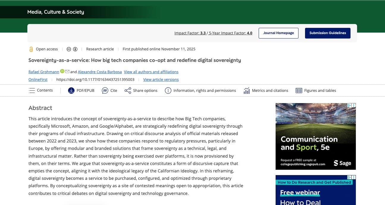 Grohmann, R. & Barbosa, A.C. (2025). Sovereignty-as-a-service: How big tech companies co-opt and redefine digital sovereignty. Media, Culture & Society. Forskningsartiklen, som introducerer begreberne sovereignty-as-a-service og sovereignty washing gennem en kritisk diskursanalyse af Amazon, Microsoft og Googles suverænitetsprogrammer.