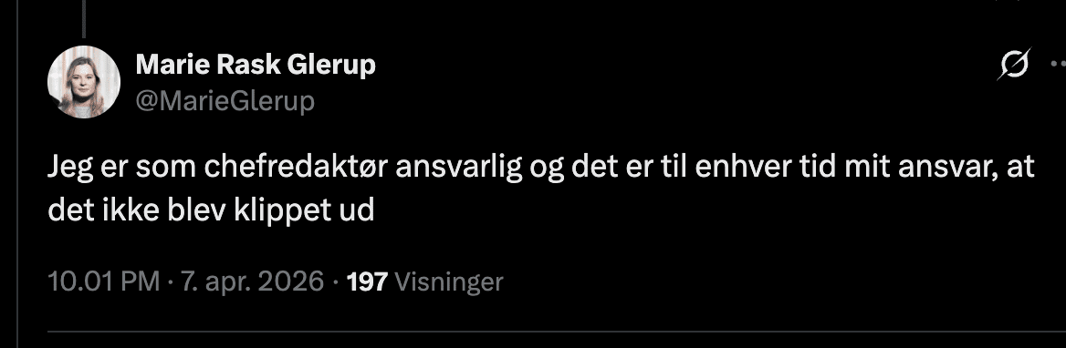 Derfor er jeg enig med chefredaktør Marie Rask Glerup i, at der kun er én ansvarlig, og det er hende som chefredaktør.