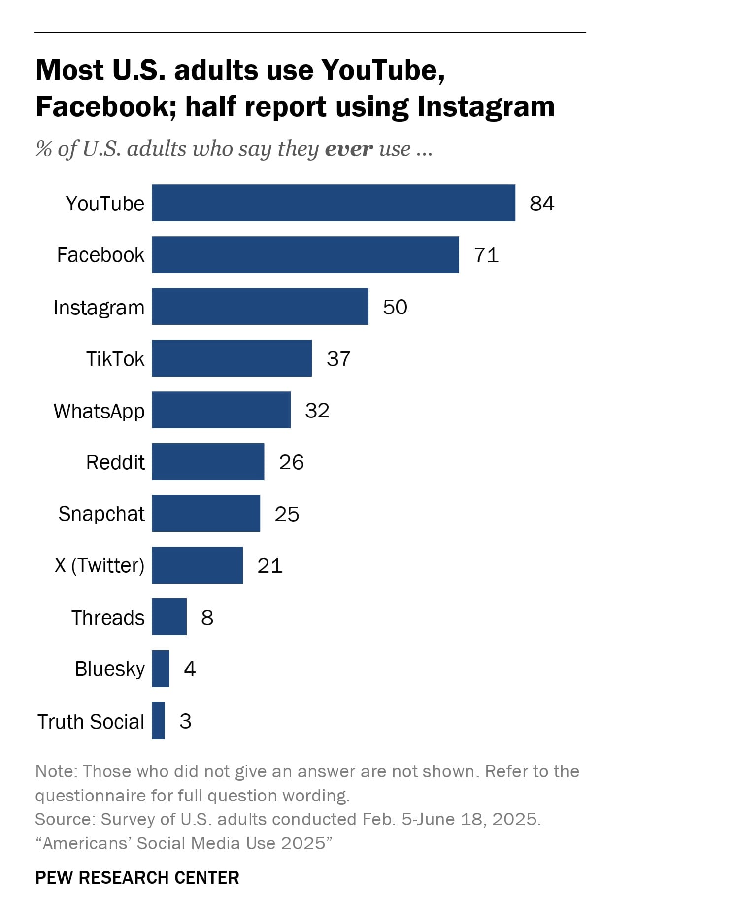Pew Research 2025 – Platformbrug blandt amerikanske voksne] YouTube topper med 84%, efterfulgt af Facebook (71%), Instagram (50%) og TikTok (37%). YouTube er den mest udbredte platform på tværs af alle demografiske grupper. Kilde: Pew Research Center, Americans' Social Media Use 2025.